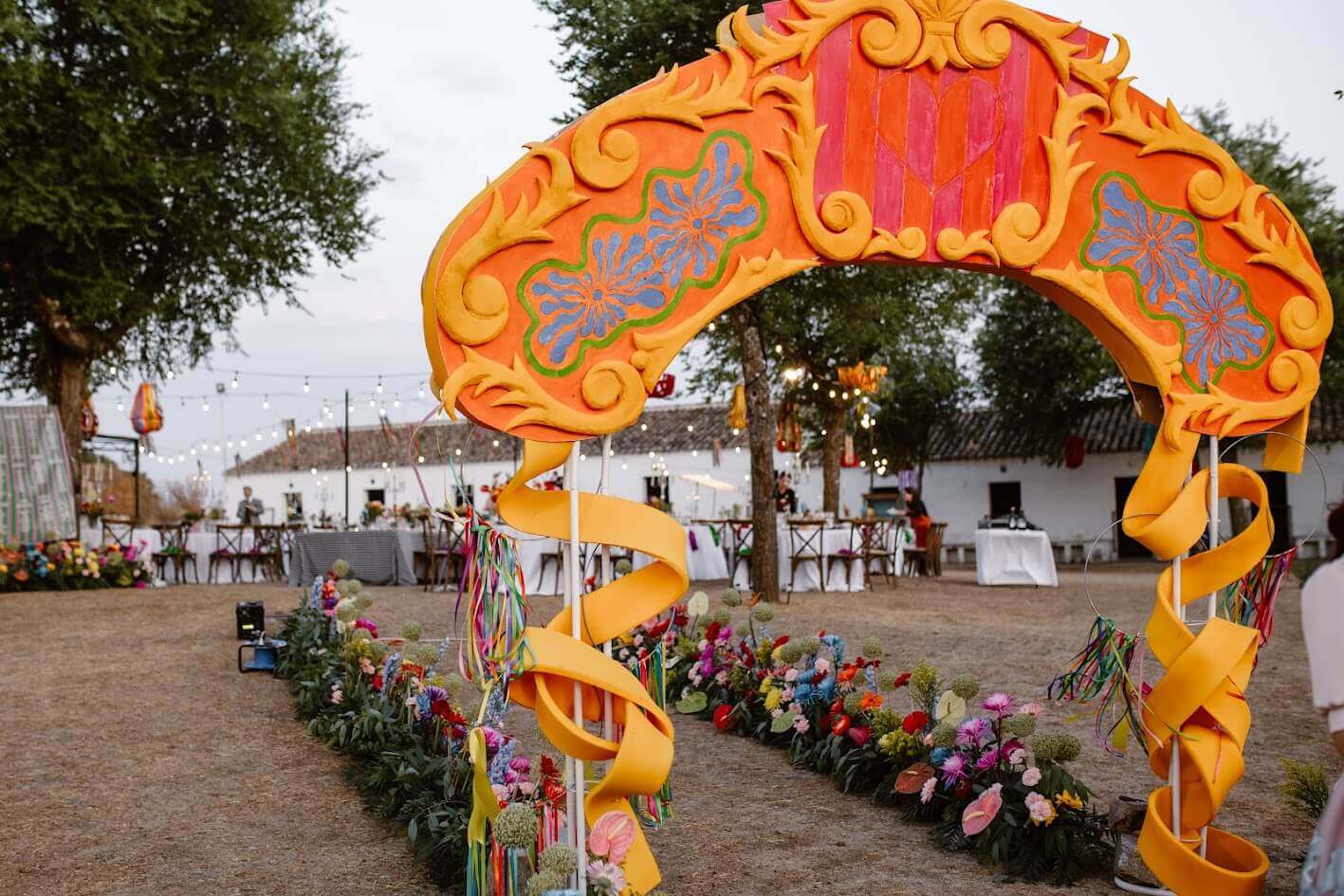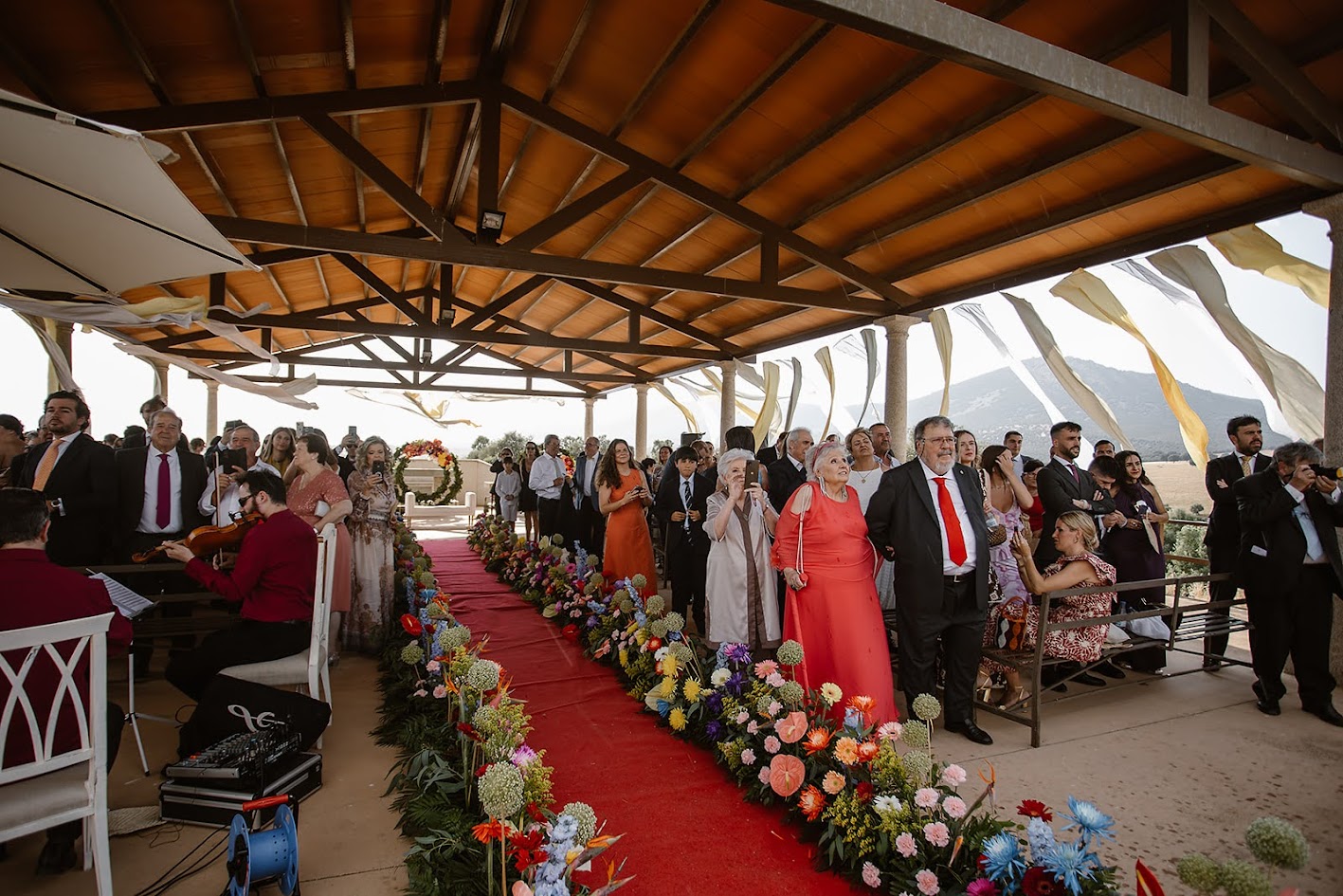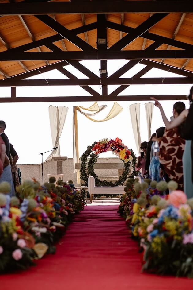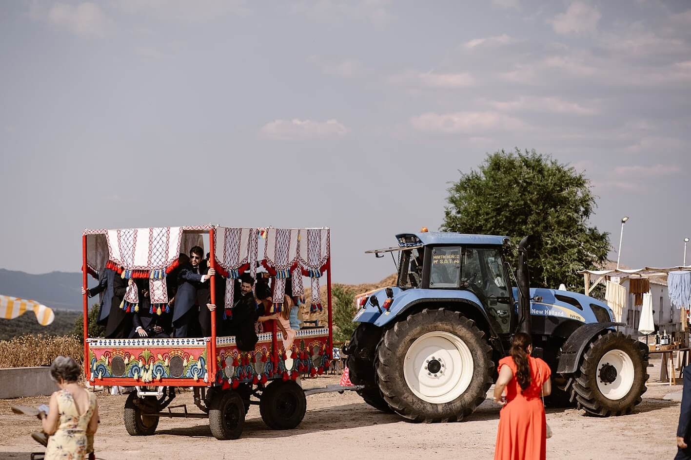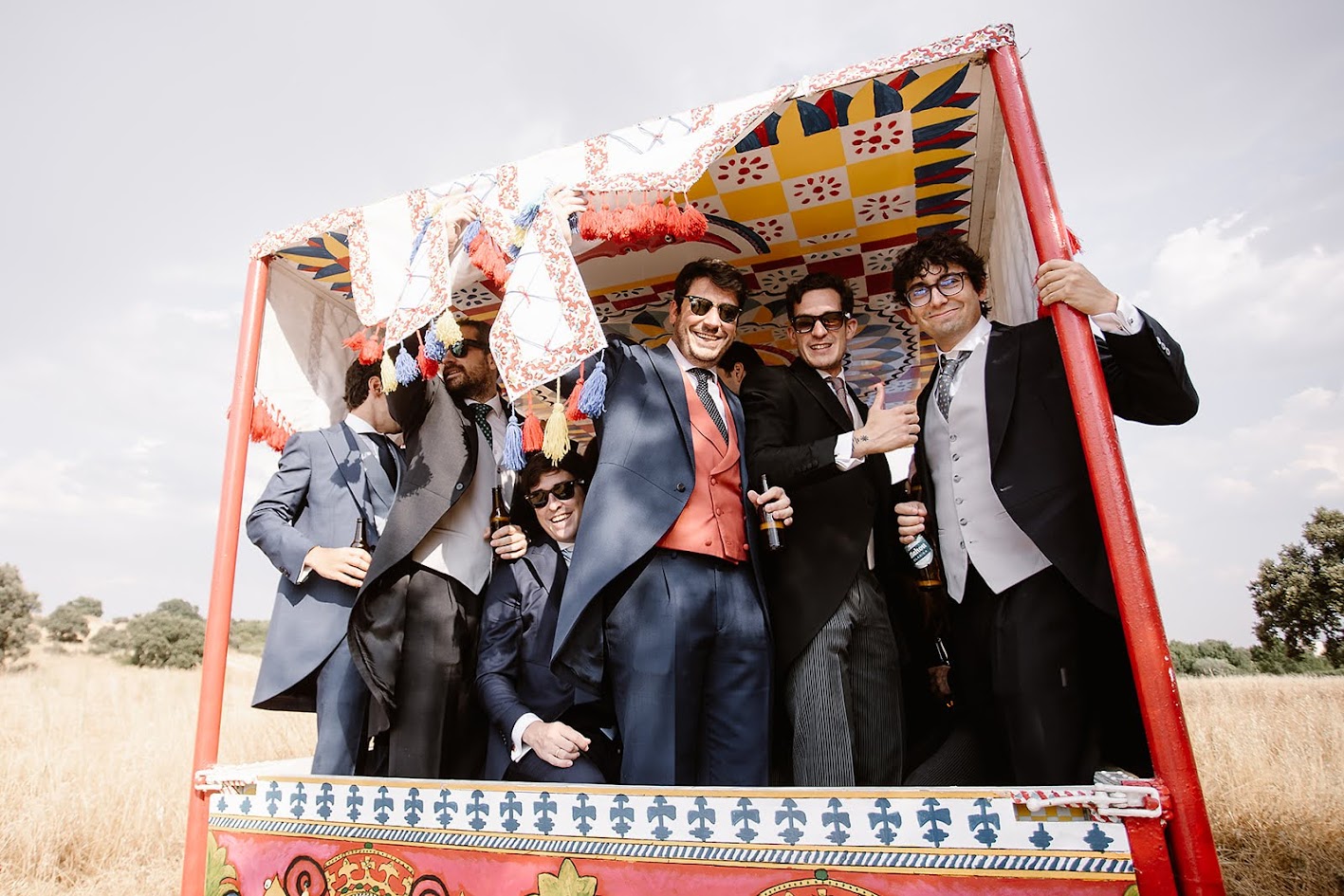 Querían una boda que inspirara vida, color y alegría, y así fue. Para llegar a la finca, los testigos lo hicieron en los tradicionales carros del Milagro, los mismos que decoraron su madre y su tía en la última romería.